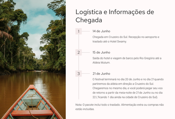 Imagine se desconectar do barulho do mundo e mergulhar no profundo silêncio da Floresta Amazônica. Durante cinco dias mágicos, você será guiado pela sabedoria ancestral do povo Yawanawa, experimentando uma tradição cultural e espiritual que vai além de uma simples viagem.